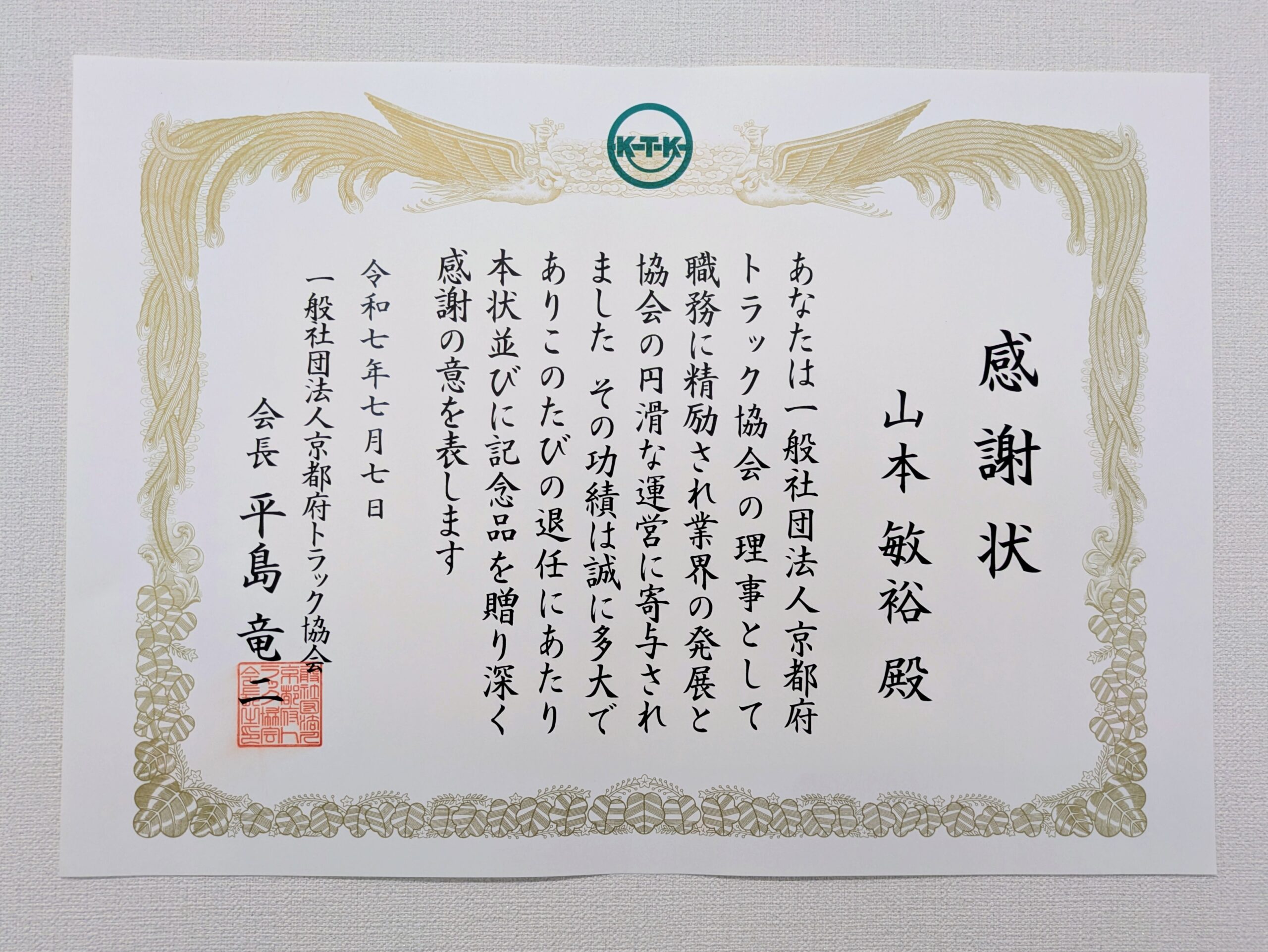 取締役会長 山本敏裕は一般社団法人京都府トラック協会理事の退任にあたり、 感謝状を拝受いたしました。