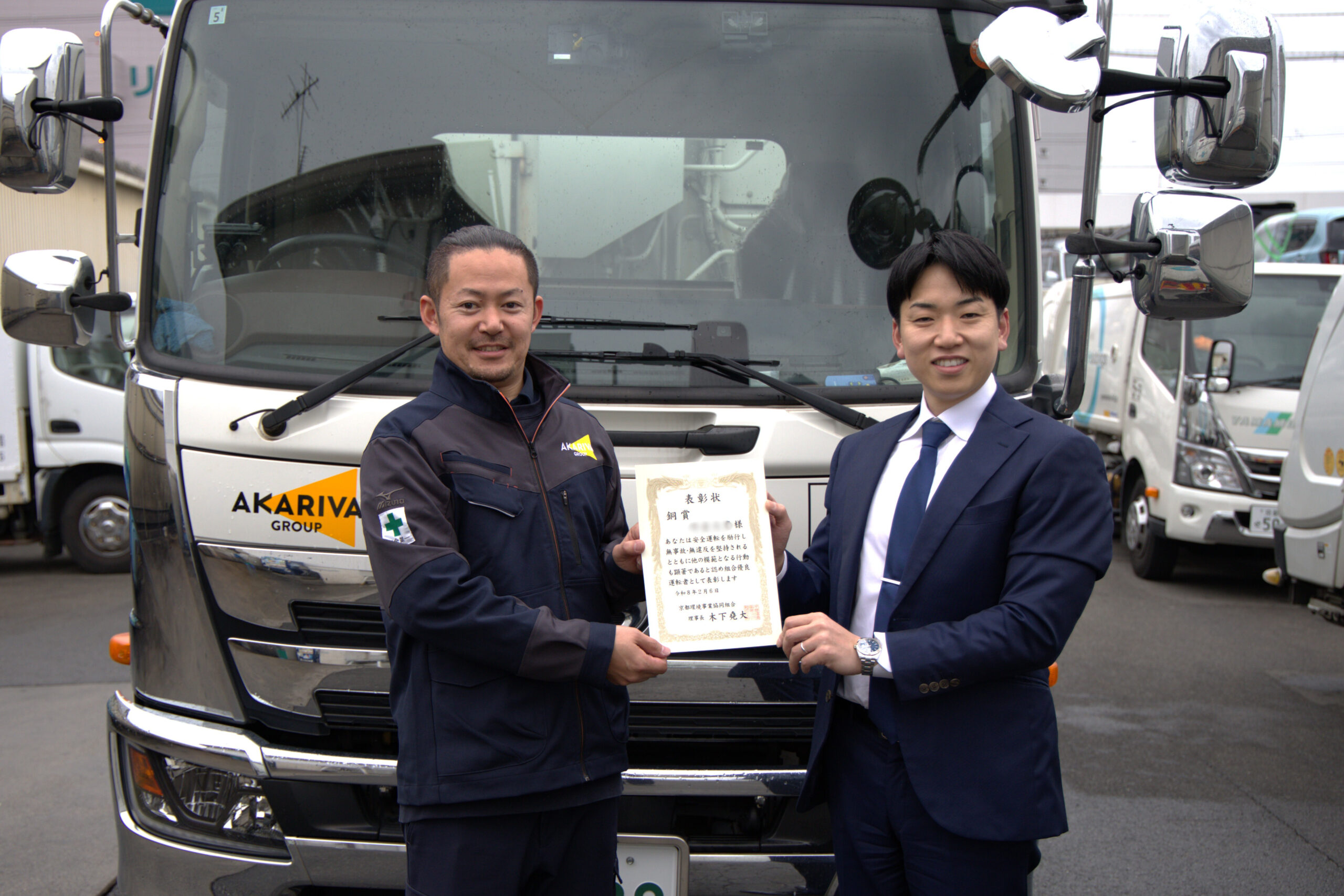 京都府優良運転者を受賞しており、「廃棄物に関する豊富な知識や技能を有し、優秀な顧客対応ができるほかの模範となる従業員」であることを評され、この度の受賞となりました。 受賞者は、10年以上の無事故・無違反で安全運転に努めて下さっています。
