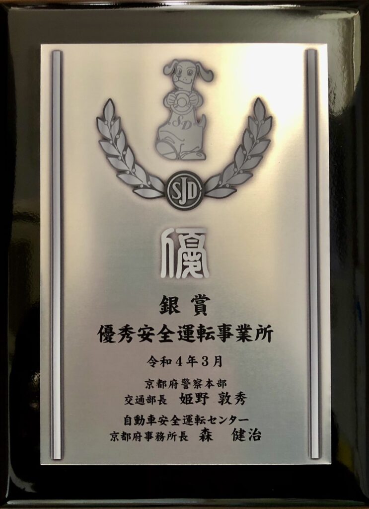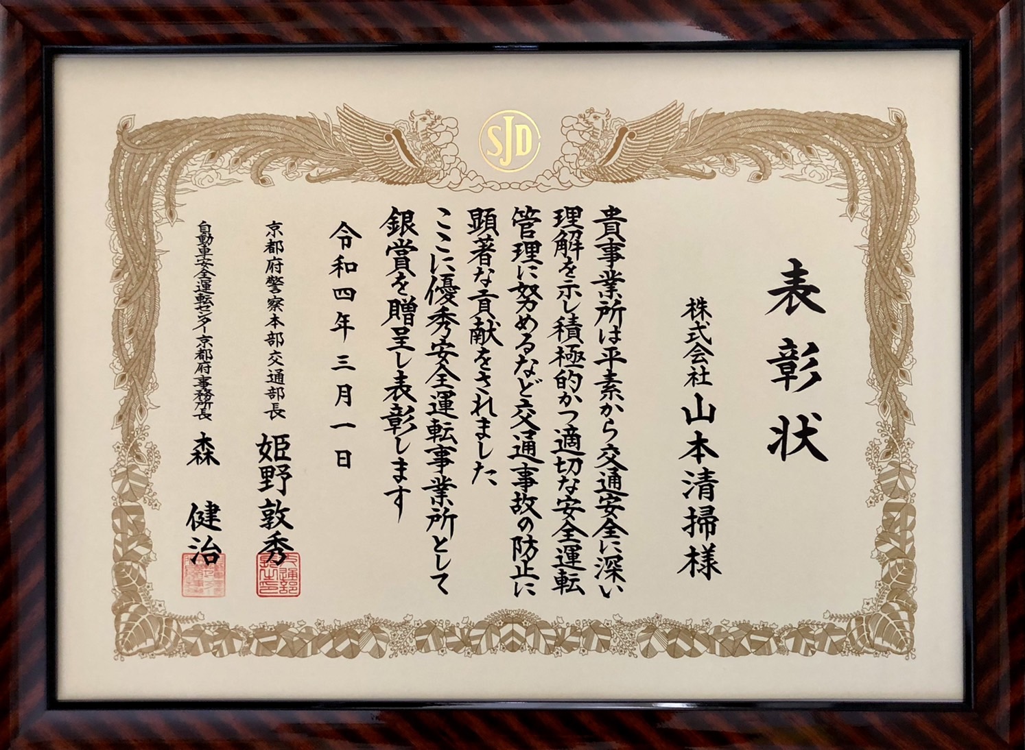 運転記録証明を発行している企業の中から、成績優秀企業を表彰する制度で、 山本清掃は自動車安全運転センターと京都府警交通部長との連名で表彰を受けました。 これはドライバーの皆さんの日々の努力の賜物です。