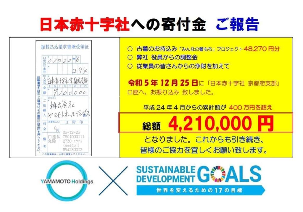 2023年12月25日 ヤマモトホールディングスが10年以上続けている、皆様からお寄せ頂いた古着を 義援金に替えて日本赤十字社へ寄付をする活動。今年も無事寄付を完了しました。