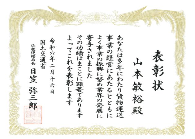 2月16日 大阪合同庁舎4号館にて国土交通省近畿運輸局令和5年自動車関係功労者表彰式典が開催され、当社会長山本敏裕が受賞いたしました。
