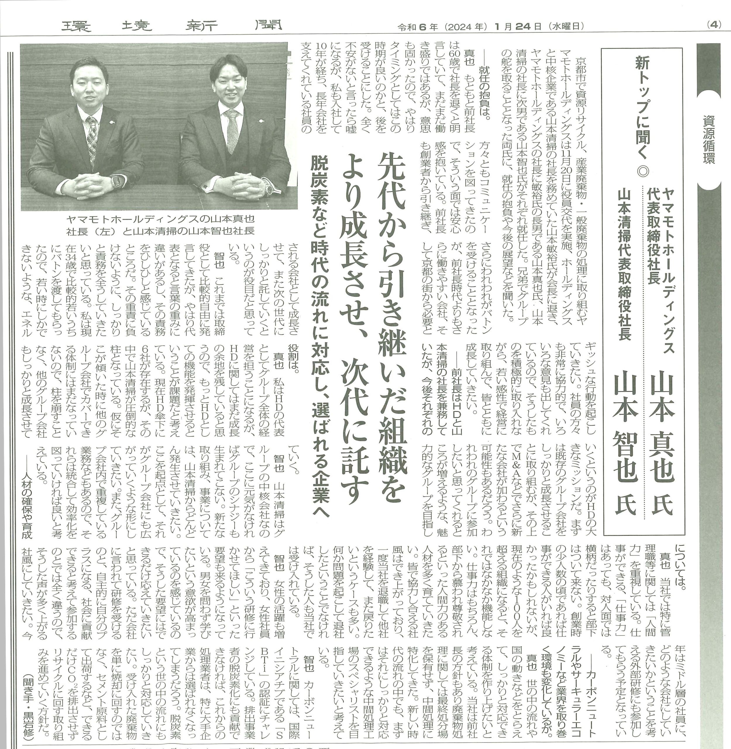1月24日に発行された環境新聞にて、 株式会社ヤマモトホールディングス 代表取締役社長 山本真也 株式会社山本清掃 代表取締役社長 山本智也 両名のインタビュー記事が掲載されました。