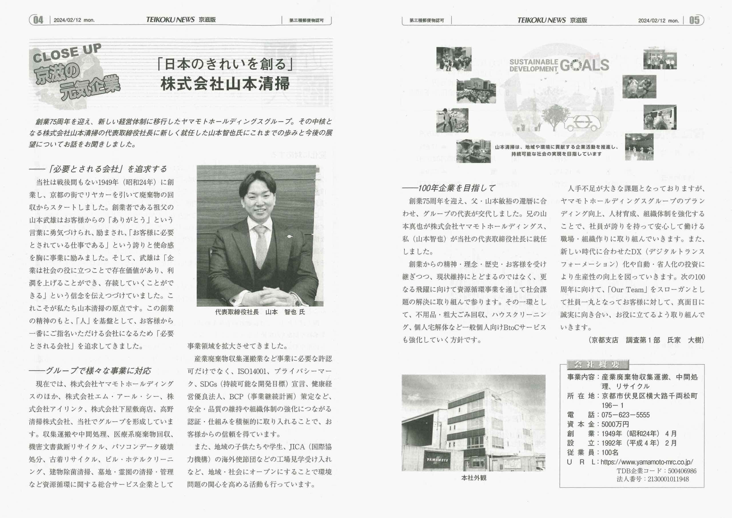 2月12日に発行された、「週間 帝国ニュース 京滋版」内コーナー 「CLOSE UP 京滋の元気企業」にてヤマモトホールディングス中核企業 株式会社山本清掃 代表取締役社長 山本智也のインタビューが掲載されました。