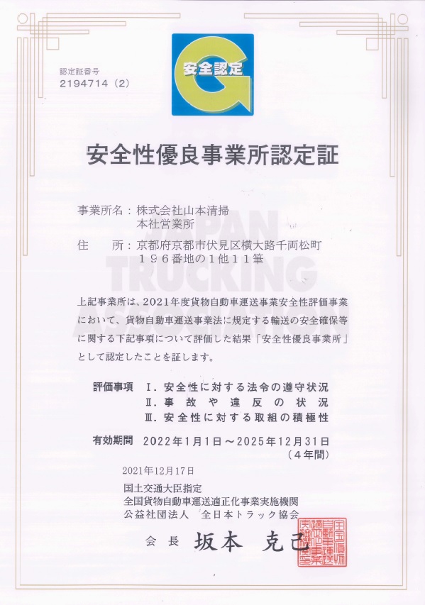 ヤマモトホールディングスグループ企業 株式会社山本清掃が、2016年12月に取得した安全性優良事業所認定(Gマーク)の2度目の更新を認定いただきました。2度目の更新から、有効期間は4年間へと延長されます。